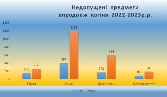 У порівнянні з квітнем 2022 року із зростанням кількість відвідувачів органів та установ системи правосуддя зросла і кількість недопущених небезпечних предметів: