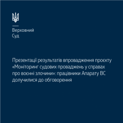 Представники управління аналітичної допомоги касаційним судам та Великій Палаті Верховного Суду департаменту аналітичної та правової роботи Апарату Верховного Суду Геннадій Зеленов і Зоя Загиней-Заболотенко взяли участь у презентації результатів впровадження проєкту «Моніторинг судових проваджень у справах про воєнні злочини».