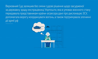 Верховний Суд залишив без зміни судові рішення щодо засудженої за державну зраду експрацівниці Укрпошти, яка в умовах воєнного стану передавала представникам країни-агресора дані про дислокацію ЗСУ, допомагала ворогу координувати вогонь