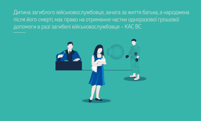 Дитина загиблого військовослужбовця, зачата за життя загиблого (померлого) та народжена після його смерті, у розумінні ст. 16-1 Закону України «Про соціальний і правовий захист військовослужбовців та членів їх сімей» належить до кола осіб, які мають право на призначення та отримання одноразової грошової допомоги у зв’язку із загибеллю військовослужбовця (15 000 000 грн).