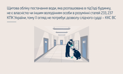 Скасовуючи ухвалу апеляційного суду, ККС ВС зазначив, що щитова обліку постачання води, яка знаходиться в під'їзді будинку, не є власністю чи іншим володінням особи, тому огляд такої щитової не потребує дозволу слідчого судді.