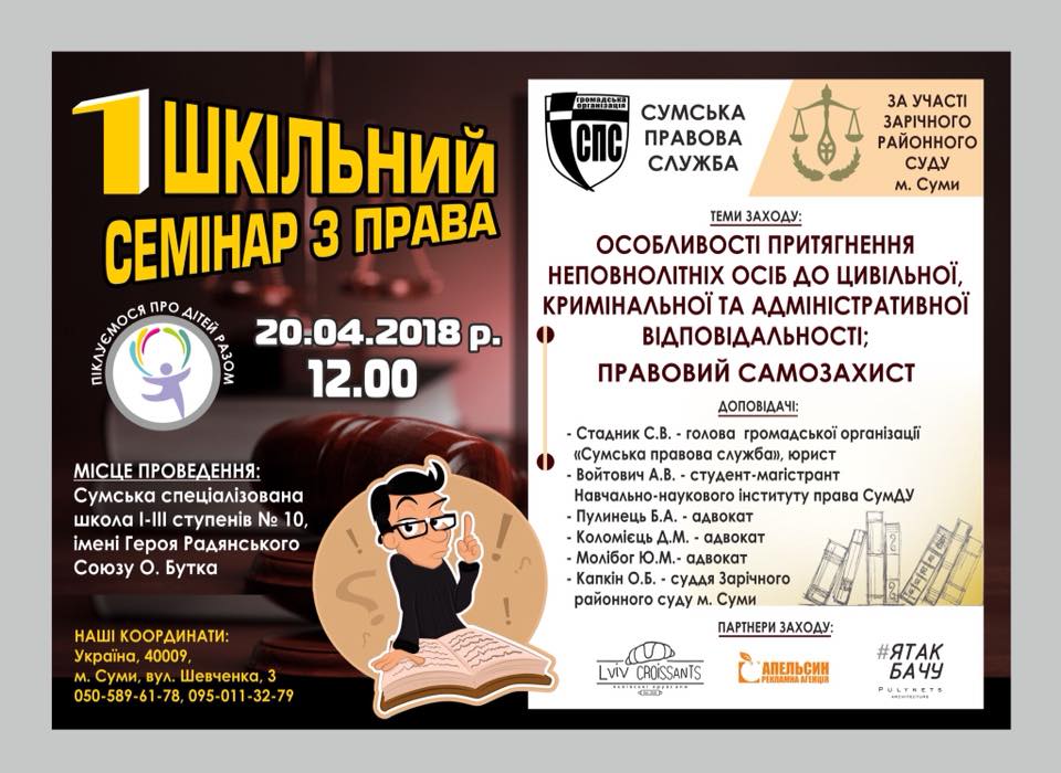 20 квітня 2018 року суддя-спікер Зарічного районного суду м. Суми Олександр Капкін в якості доповідача візьме участь у 1 шкільному семінарі з права, який відбудеться на базі Сумської спеціалізованої школи І-ІІІ ступенів № 10, імені Героя Радянського Союзу О. Бутка.